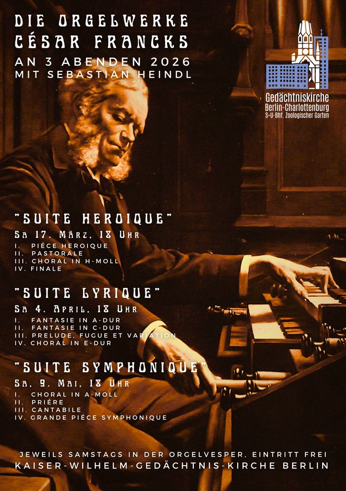 Im Jahr 2026 widmet sich der Organist der Kaiser-Wilhelm-Gedächtniskirche, Sebastian Heindl, in der Orgelvesper einem besonderen Projekt: einer zyklischen Aufführung der Orgelwerke von César Franck. Franck gilt als Begründer der französisch-sinfonischen Orgelmusik und wurde aufgrund der Genialität seiner Kompositionen nicht selten als der „französische Beethoven“ bezeichnet. Sein berühmter Ausspruch „Mon orgue, c’est un orchestre“ bringt den orchestralen Klang seiner Musik auf den Punkt.